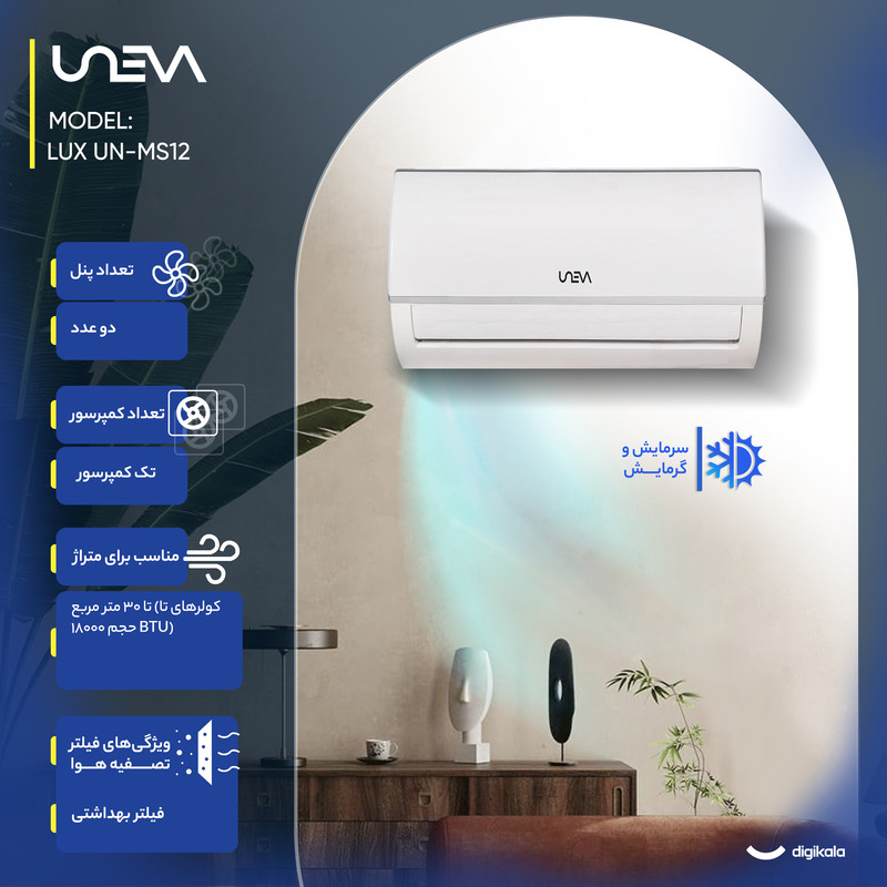 نمایشگر دیجیتال روی ریموت , کنترل کامل تنظیمات دما و فن , تنظیم تایمر از طریق ریموت , تنظیم جهت پرتاب باد از راه دور , قابلیت تنظیم حالت توربو از ریموت , طراحی ارگونومیک و سبک